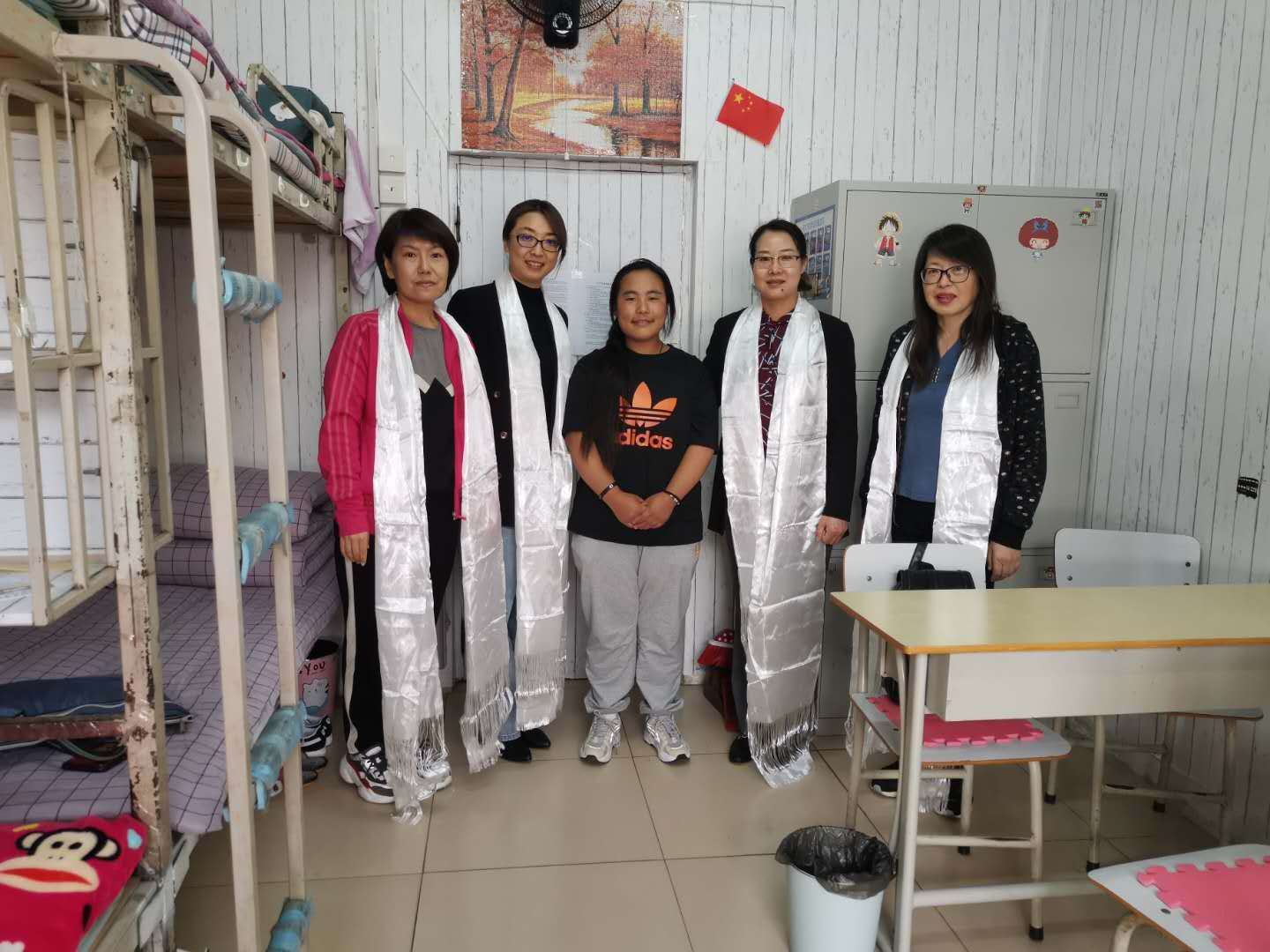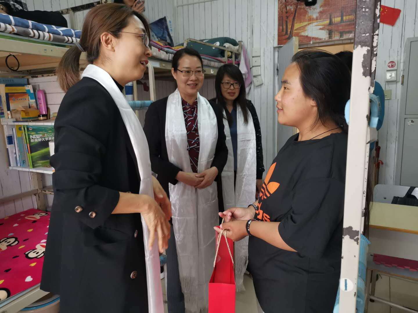 在走访藏族学子寝室过程中,郭院长亲切的询问了他们的学习和生活情况和并询问他们当前存在的困难,鼓励同学们认真思考“参加高考为什么,到了大学干什么,离开大学有什么”,鼓励他们把个人的理想追求融入国家和民族的事业中努力成才,今后为国家和家乡的发展做出贡献。叶琳书记还亲切的提醒同学们合理安排生活时间,鼓励不同民族同学之间要相互学习、相互帮助、珍惜缘分和大学美好的学习时间。学生们听完老师的教导,万分感动。为表示对老师们的感谢,同学们按照当地习俗进行了献哈达活动。白色的哈达不仅仅代表着纯洁、美好、吉祥,更多表达的是对老师的感激之情。最后学生们纷纷感谢学院领导和老师们的关怀,表示在今后的学习生活中会不断提高自身综合素质,努力学好本领,在奋斗中实现人生价值。